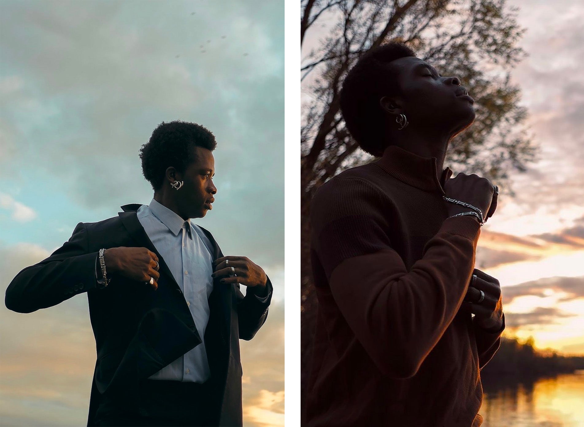 Damien Lemaire and Maxime Samo bring the 1.06 loops from the Abrazo collection to life. Set in a natural environment and illuminated by the light of an autumn evening, these photographs feature Maxime wearing the contemporary-designed loops. Mermere reinterprets the codes of traditional jewelry, drawing inspiration from piercing aesthetics to give these hoop earrings a contemporary and experimental tone.