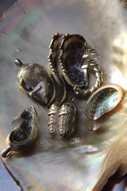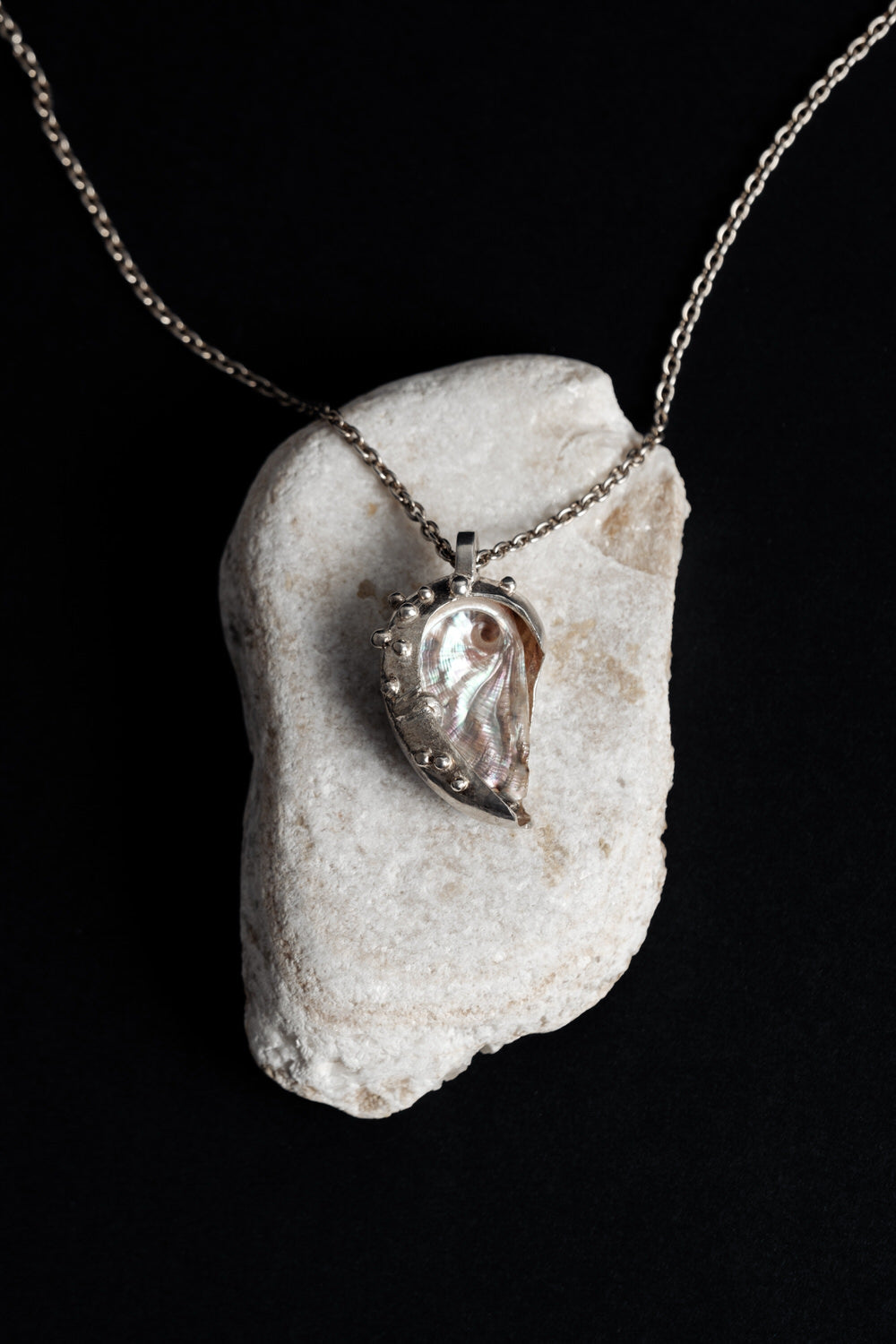 This one-off selection of seashell earrings is intended to showcase the natural beauty of a real seashell. The earring is a seashell mounted on a simple hoop, with or without a small shell piercing. The shells come from second hand necklaces. They are re-pierced to be worn on the ear. Their aesthetic echoes the curves of our own ears.