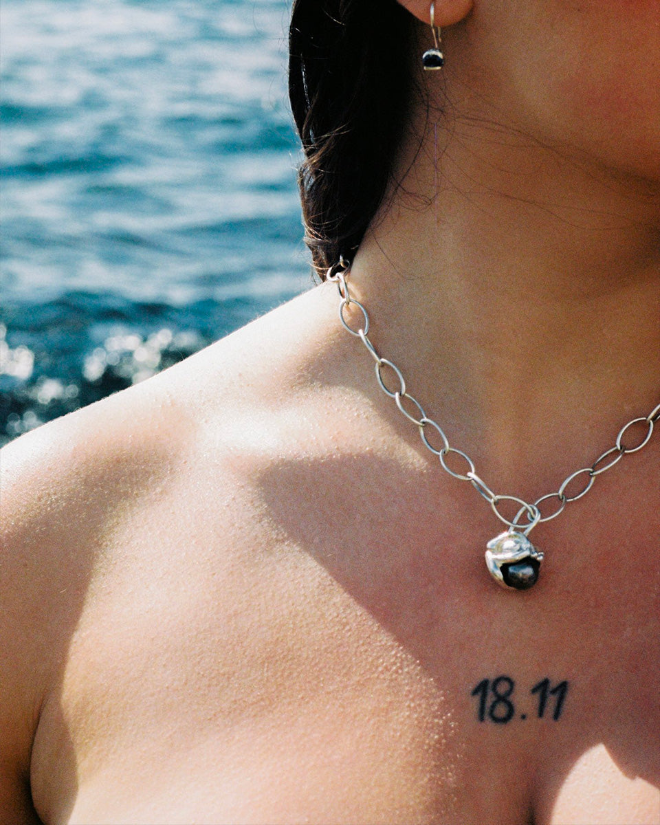 In this new version of the Delphis pendant, the gemstone makes room for a Tahitian black pearl. This luminous black mother-of-pearl is filled with mystery and reflects the depths of the Tahitian lagoons. We choose to work with black Tahitian pearls for their high quality standard and their production made in France.