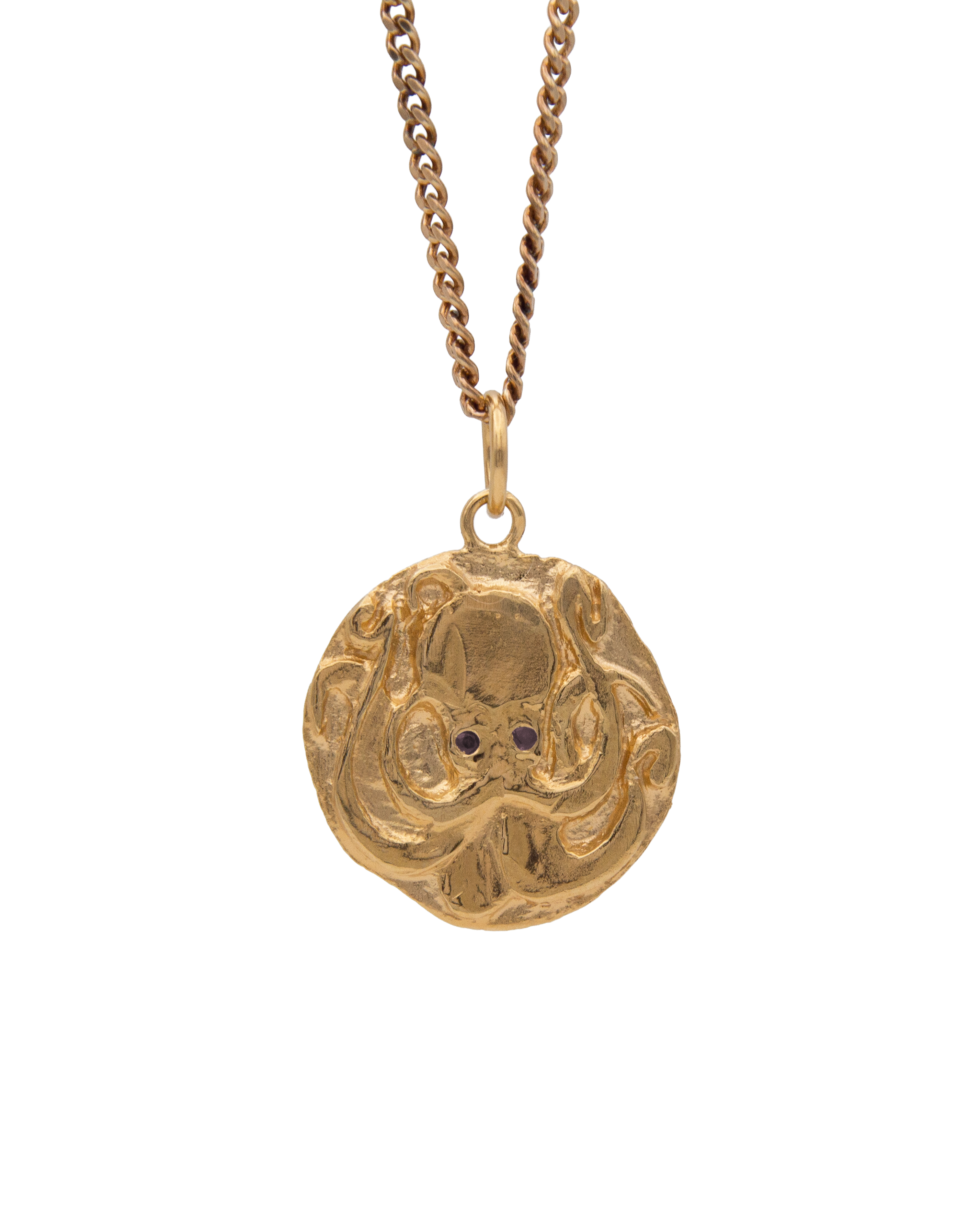 The Octopus medallion is an iconic piece from Mermere. With three hearts, nine brains, and blue blood, the octopus is a fascinating creature. The medal is a tribute to this majestic animal. A hand carved signature of the studio appears on the back of the pendant.