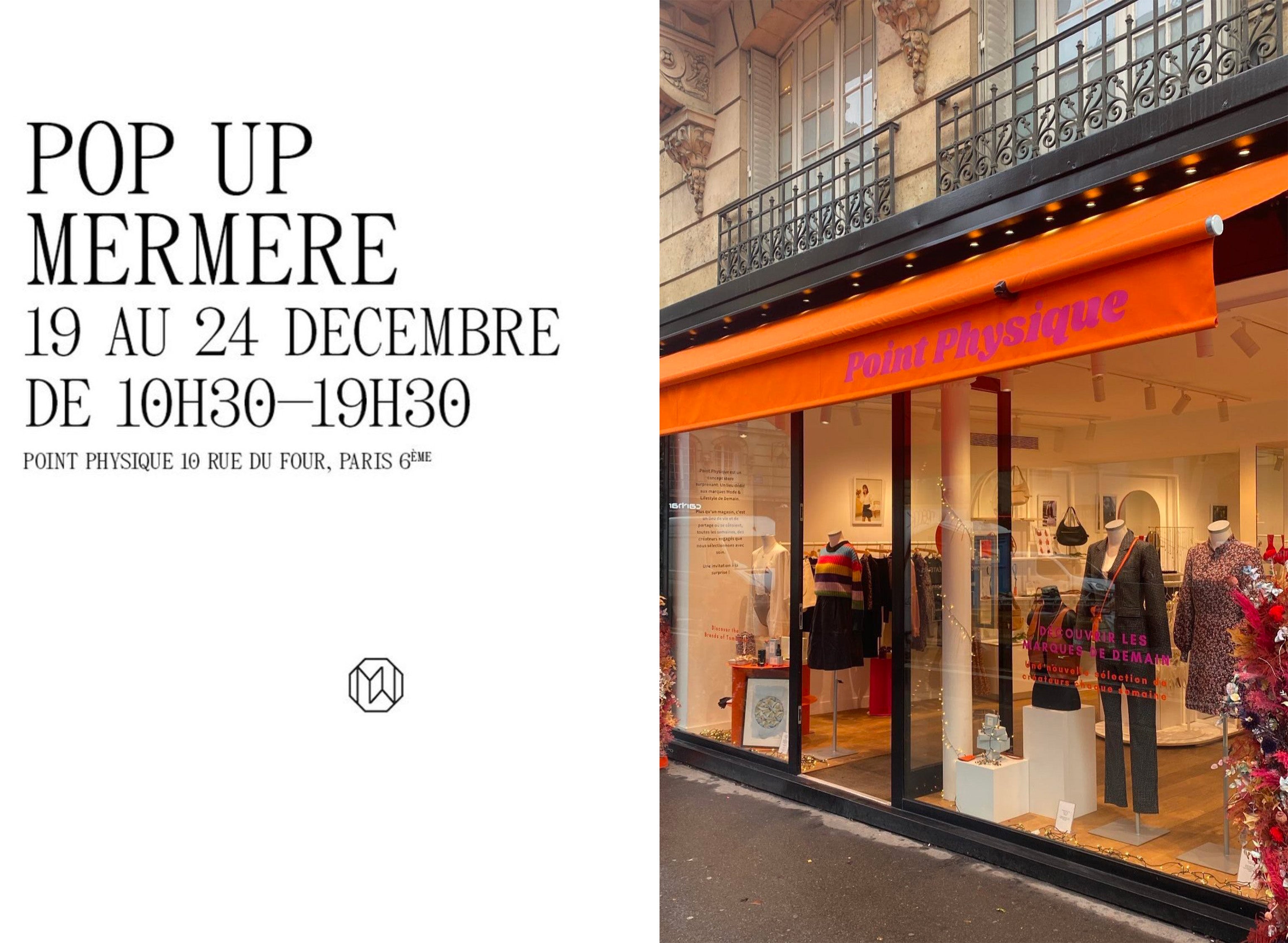 Mermere sera présent à Point Physique pop-up store du 19 au 24 décembre. Une sélection de marques engagées et éthiques est à découvrir au cœur de St Germain à Paris, au 10 rue du Four dans le 6ème arrondissement. C'est un espace pensé pour les créateurs indépendants qui explorent la mode et la création dans une perspective durable.