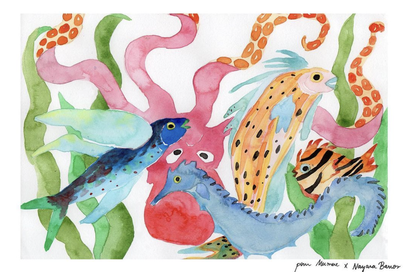 Chaque année, Mermere crée des cartes de vœux en collaboration avec un artiste. Chaque illustration est unique, avec des styles et des graphismes différents pour répondre à des goûts variés. Cette année, Mermere envoie ses vœux avec la collaboration de Nayara Barros ! Nayara est une artiste brésilienne basée à Marseille, connue pour son utilisation vibrante des couleurs et ses représentations d'animaux et de plantes sur divers supports. Pour célébrer la nouvelle année, elle a créé une aquarelle inspirée du monde sous-marin pour Mermere.