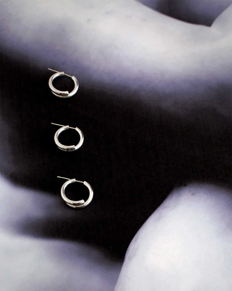 La petite boucle d'oreille 1.06 met en valeur une esthétique brute et des formes géométriques. Chaque boucle d'oreille est un effet d'optique, inspiré de l'esthétique du piercing. C'est un produit qui peut être combiné à l'infini.