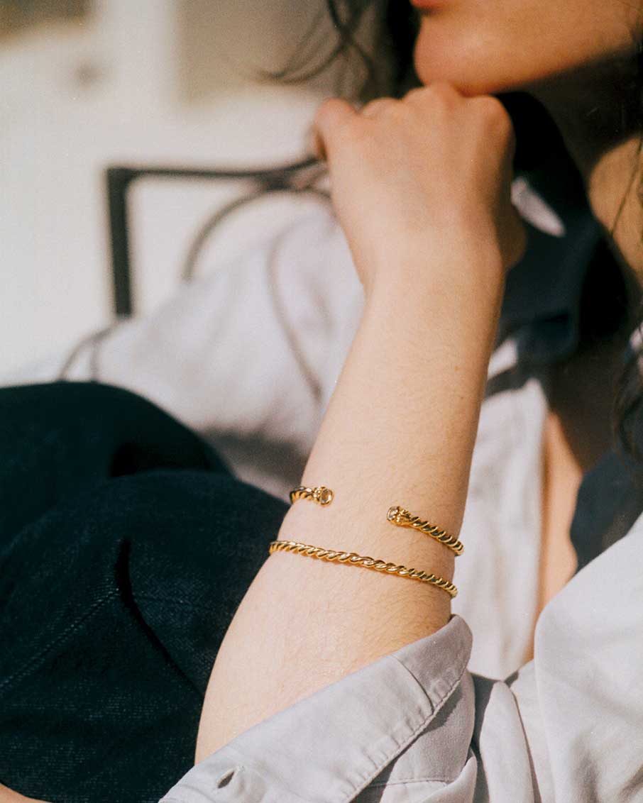 Au cœur de la collection Delphis, la torsade se déploie comme une mélodie apaisante, une forme rassurante et intemporelle. Ce bracelet torsadé enveloppe le poignet dans un mouvement fluide et harmonieux, symbole de continuité et d’équilibre. Une pièce à la fois graphique et poétique, parfaite pour sublimer le quotidien.