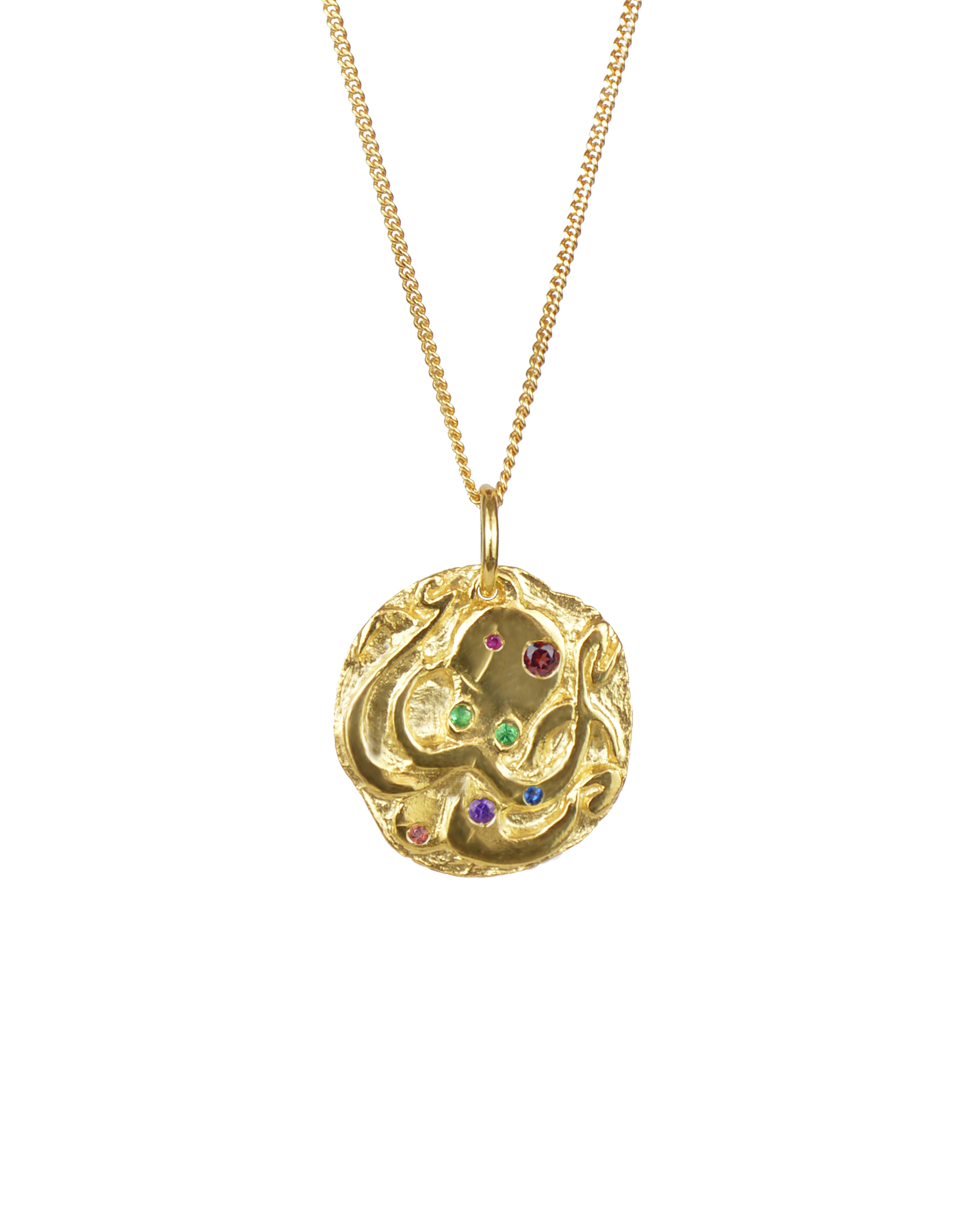 La version polychromatique associe une paire de pierres précieuses (deux saphirs, deux rubis ou deux émeraudes) représentant les yeux de la pieuvre, avec quatre pierres semi-précieuses choisies parmi une sélection de six gemmes (topaze, grenat, péridot, améthyste, tourmaline, citrine). Une combinaison unique de ces pierres fait de chaque pendentif un bijou unique.