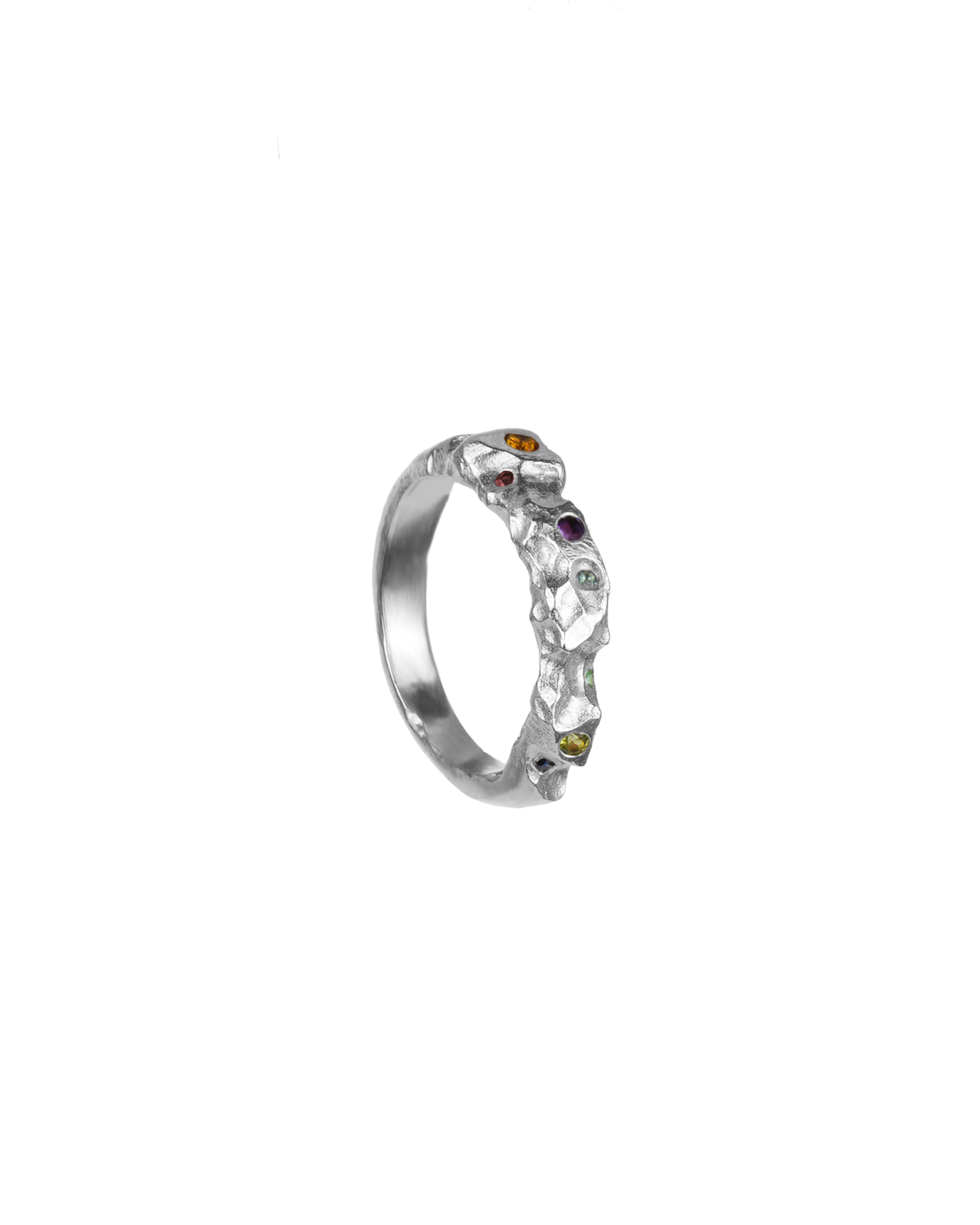 À travers des formes audacieuses et sculpturales, ainsi qu’un jeu subtil de textures, chaque pièce capture la manière dont la lumière traverse l’eau — se déplace, se reflète et révèle des éclats inattendus. L’association de pierres précieuses et semi-précieuses évoque la richesse de la vie marine : vibrante, diverse et délicatement équilibrée.