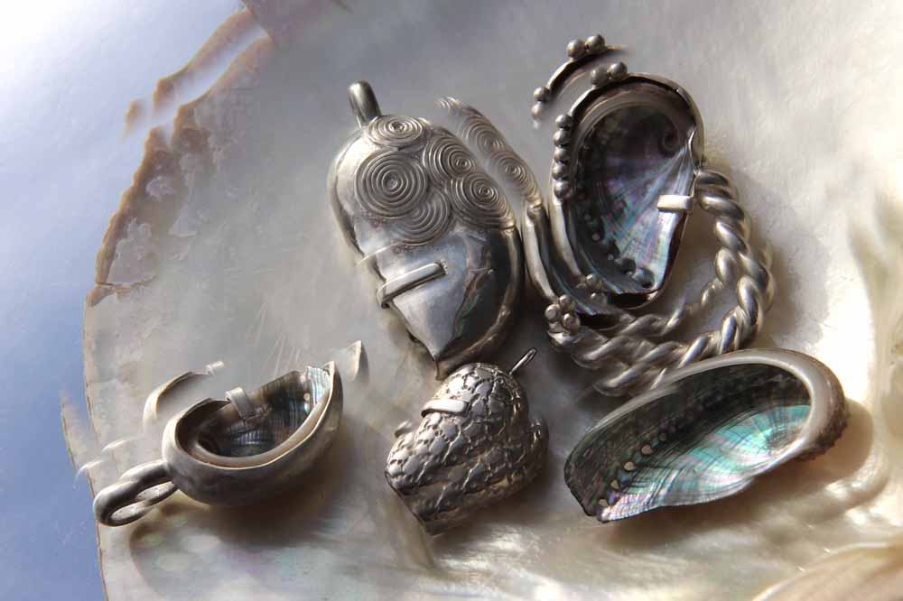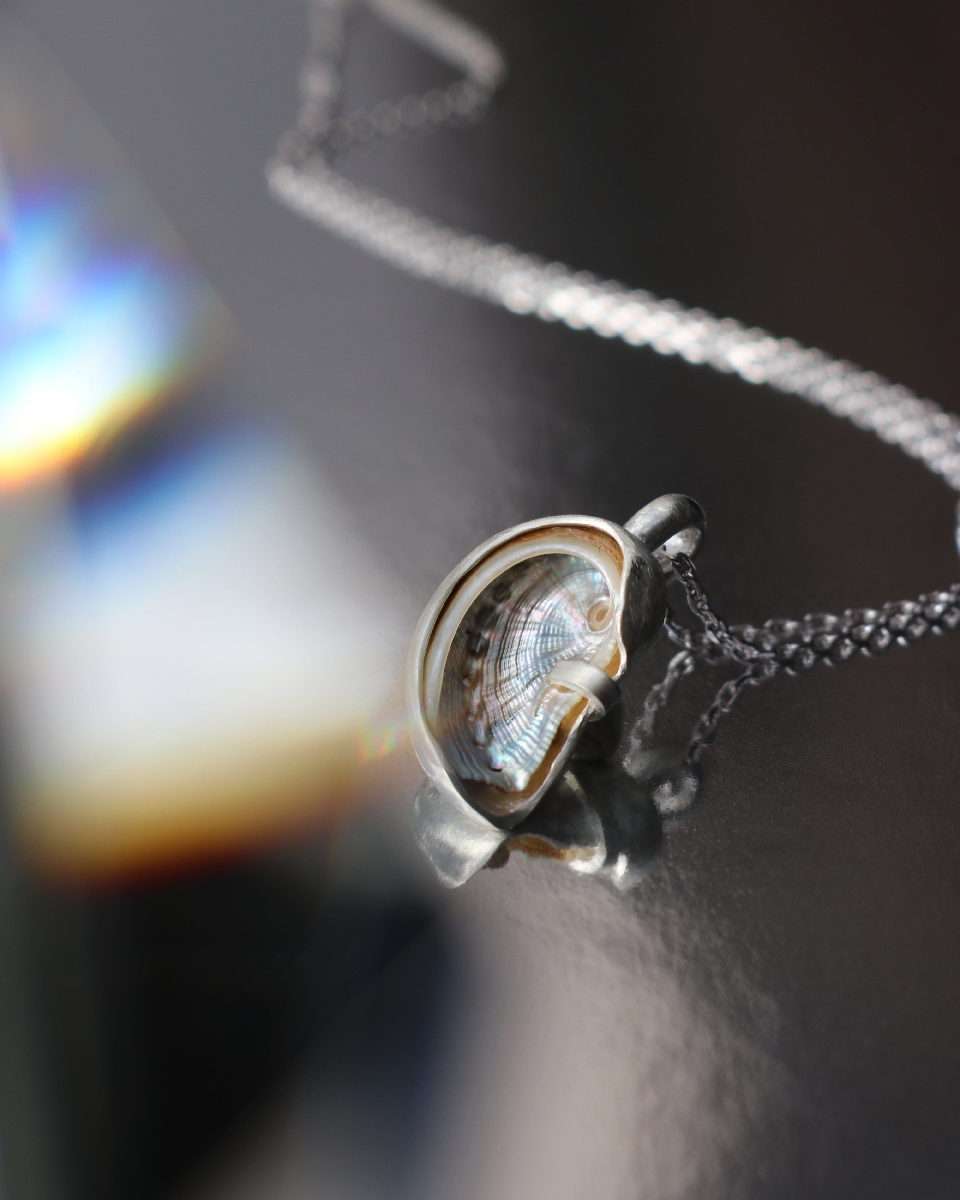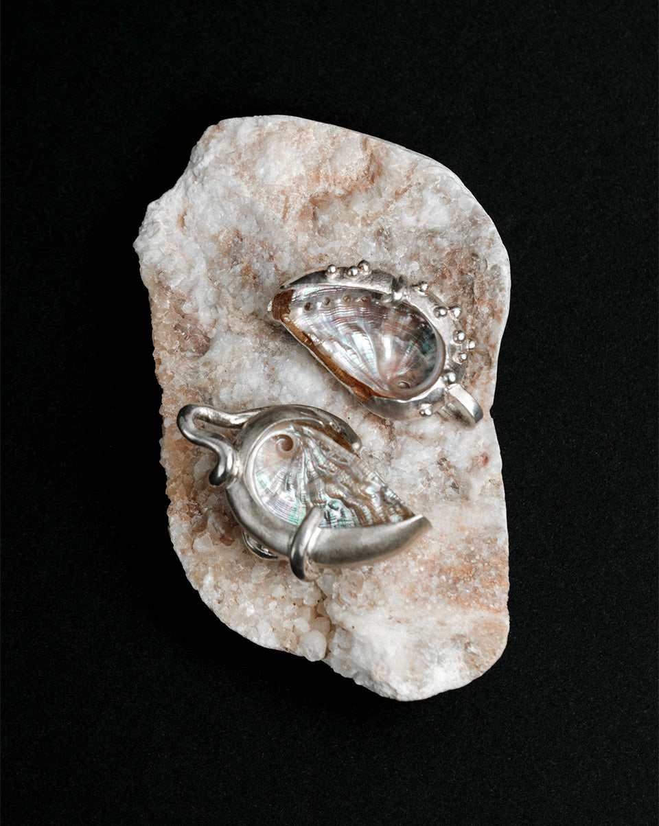 The amulets feature treasures from the sea, such as abalone, coral, and other marine wonders, carefully set in a variety of materials, subtly revealing their natural beauty and colors. Each piece of jewelry is custom-made and unique, as every seashell has its own story.