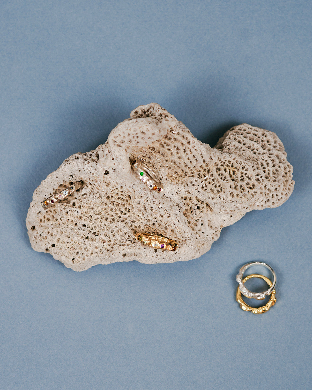 Through bold, sculptural forms and a subtle interplay of textures, each piece captures the way light filters through water, shifting, reflecting, and revealing unexpected brilliance. The combination of precious and semi-precious gemstones echoes the richness of marine life: vibrant, diverse, and delicately balanced.